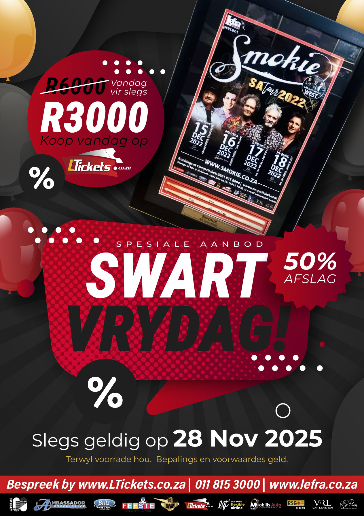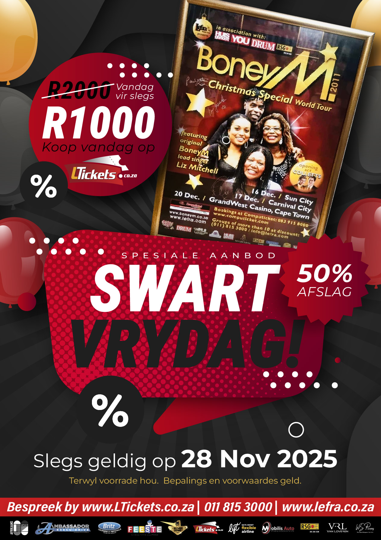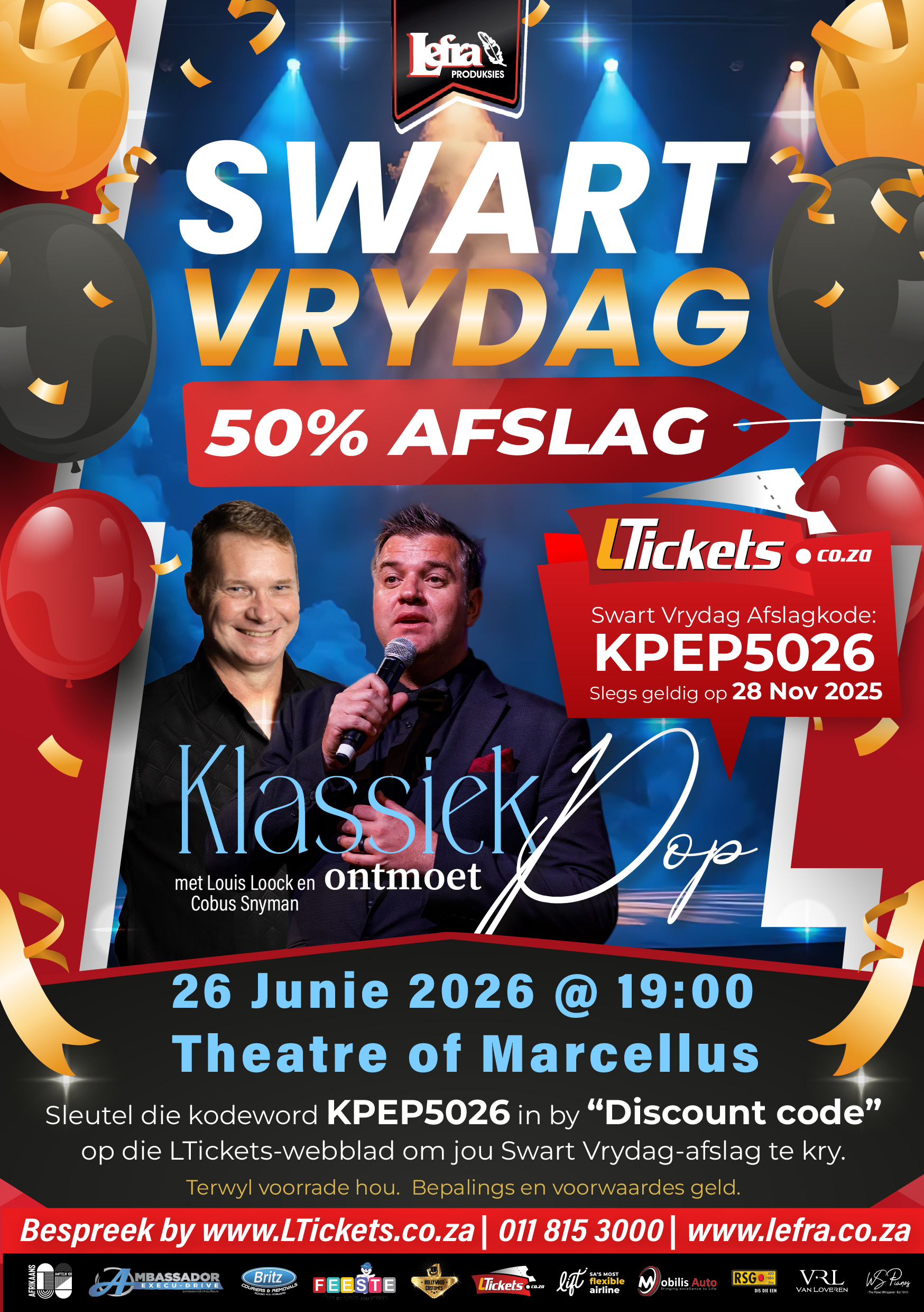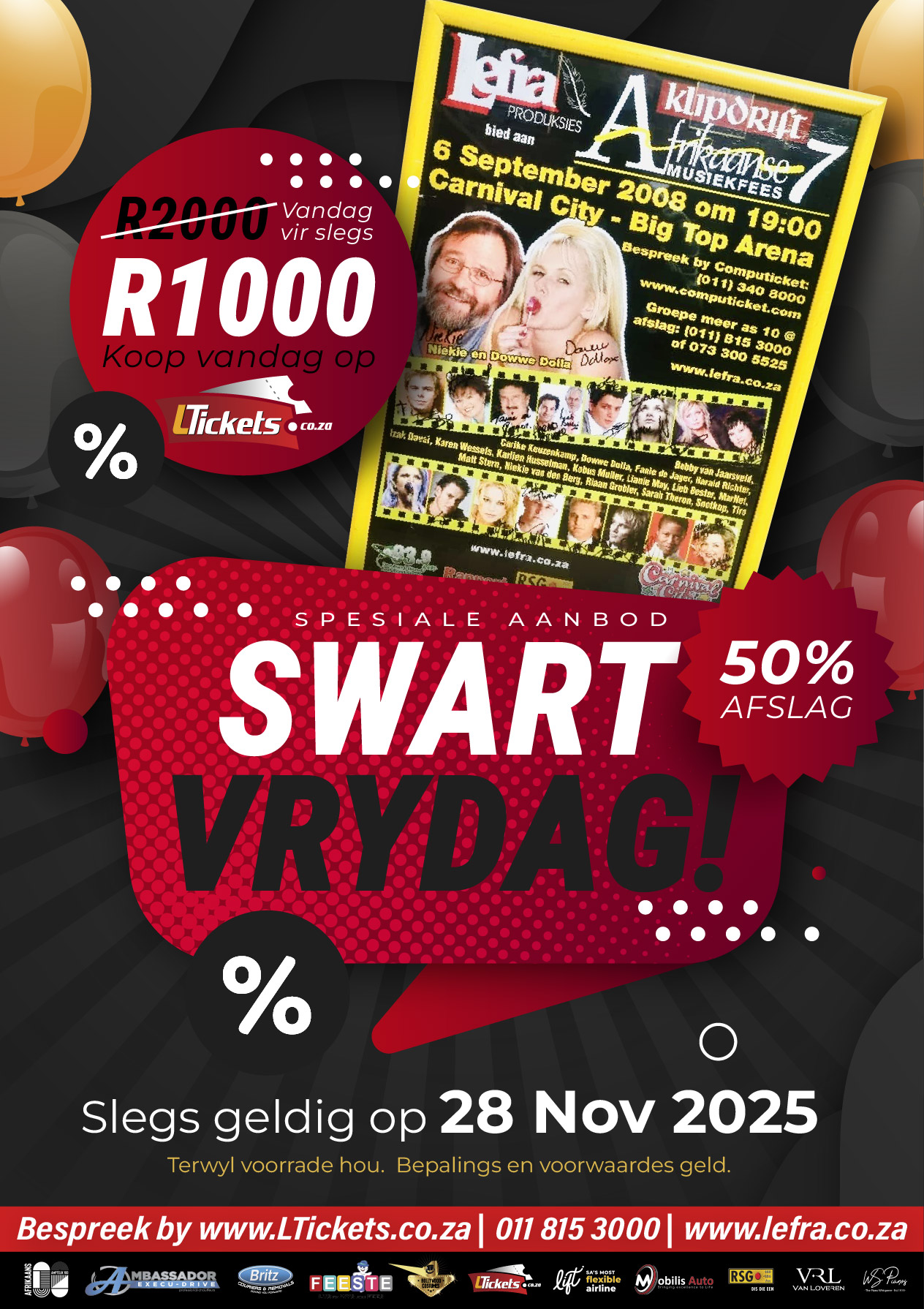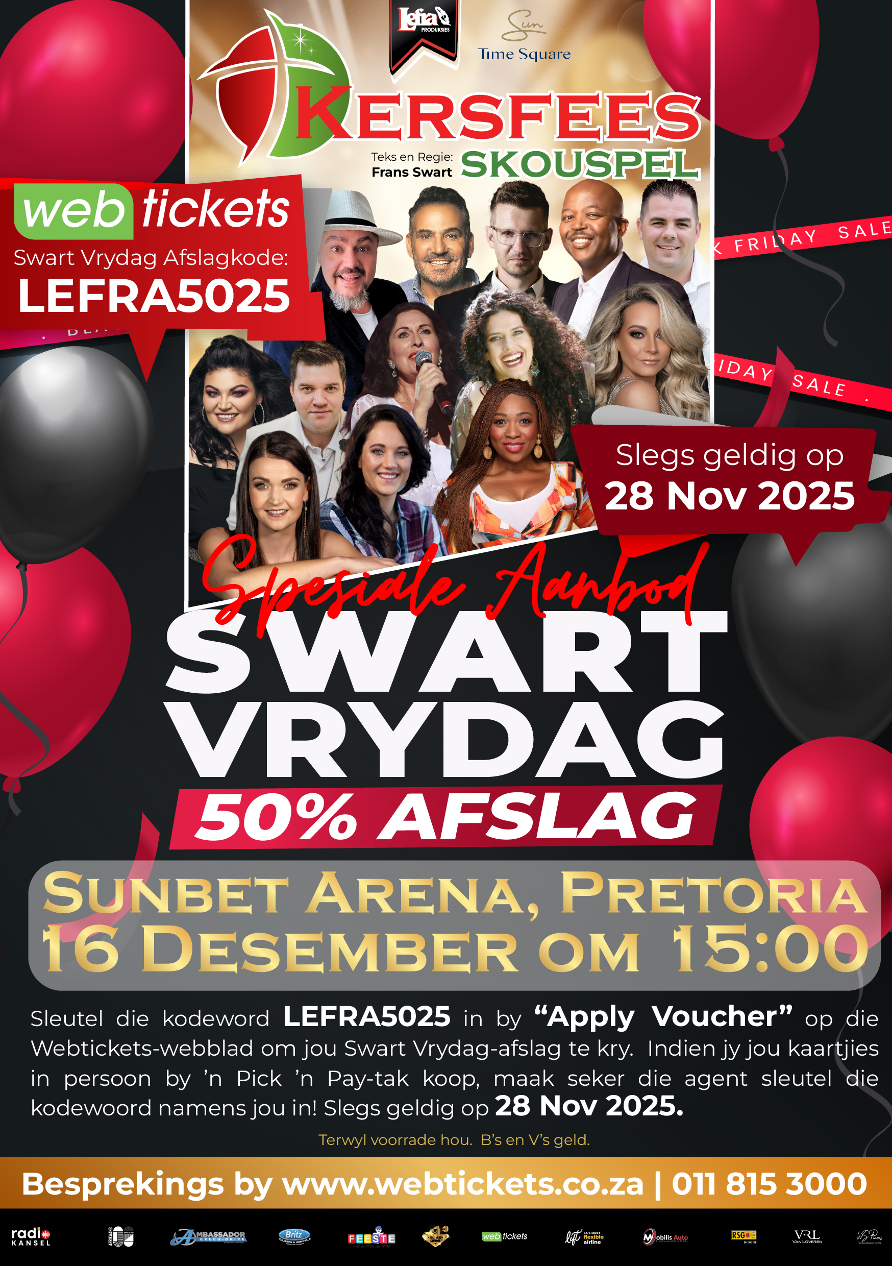 Kry jou kaartjies op Swart Vrydag (28 November 2025 tot 24:00) teen ongelooflike afslag op jou gunsteling “show”!