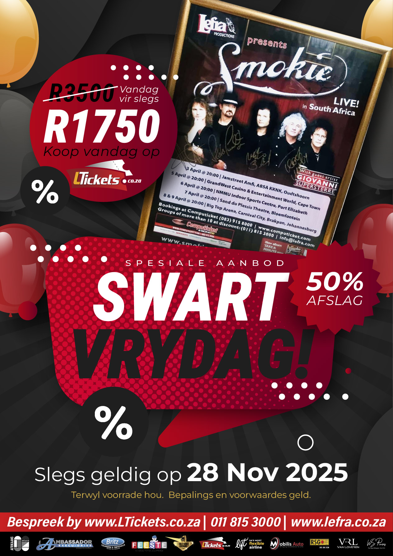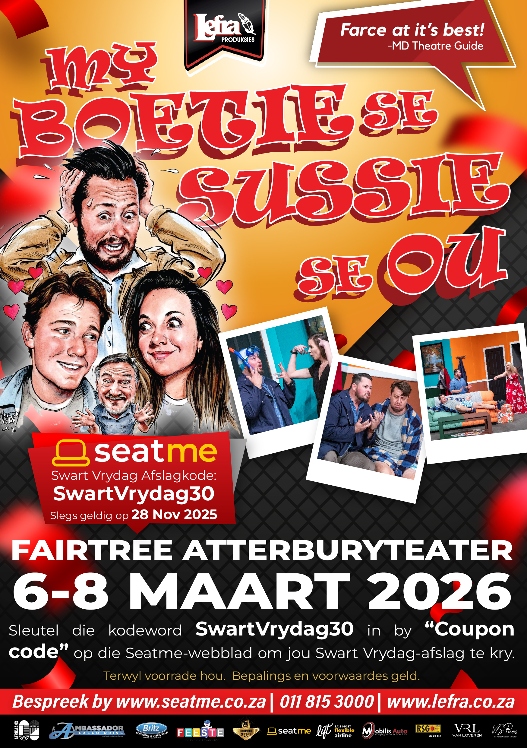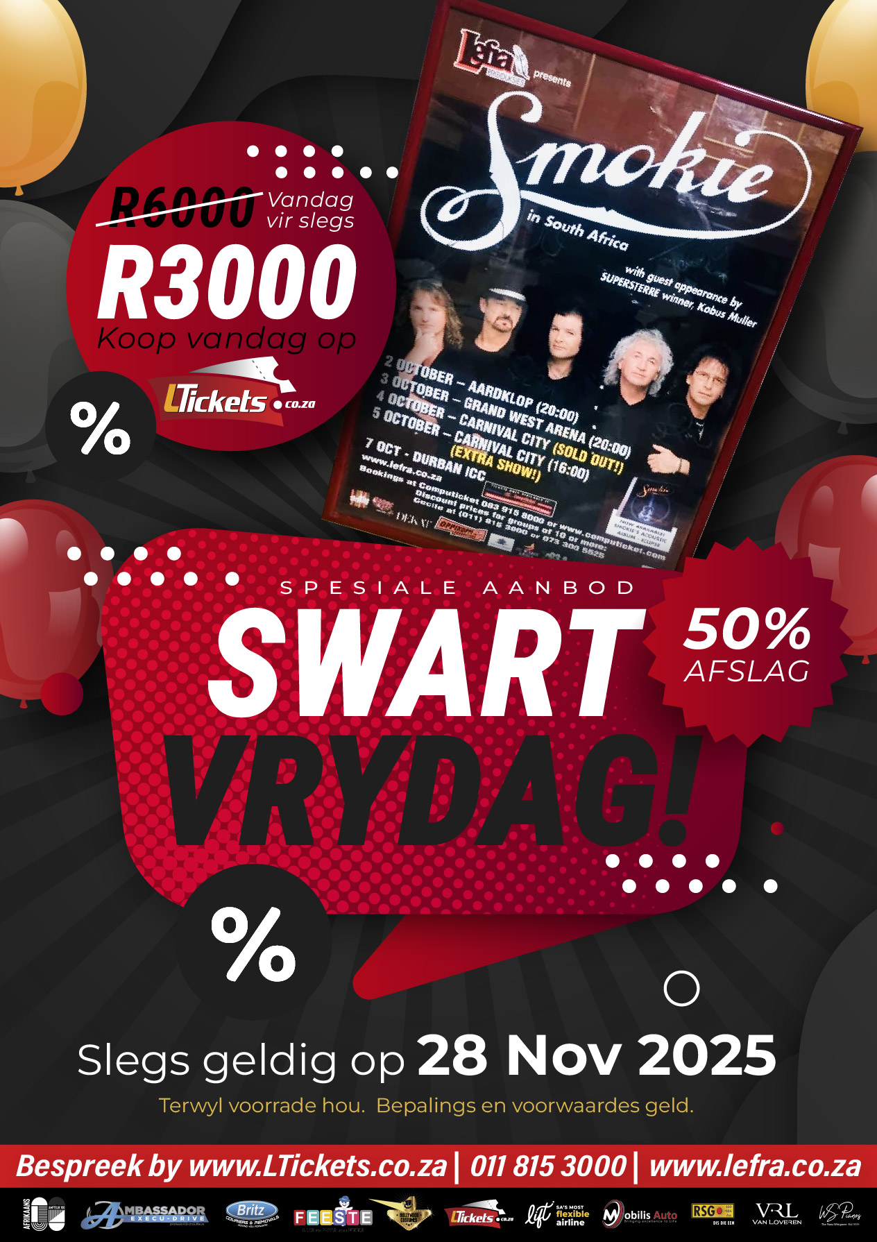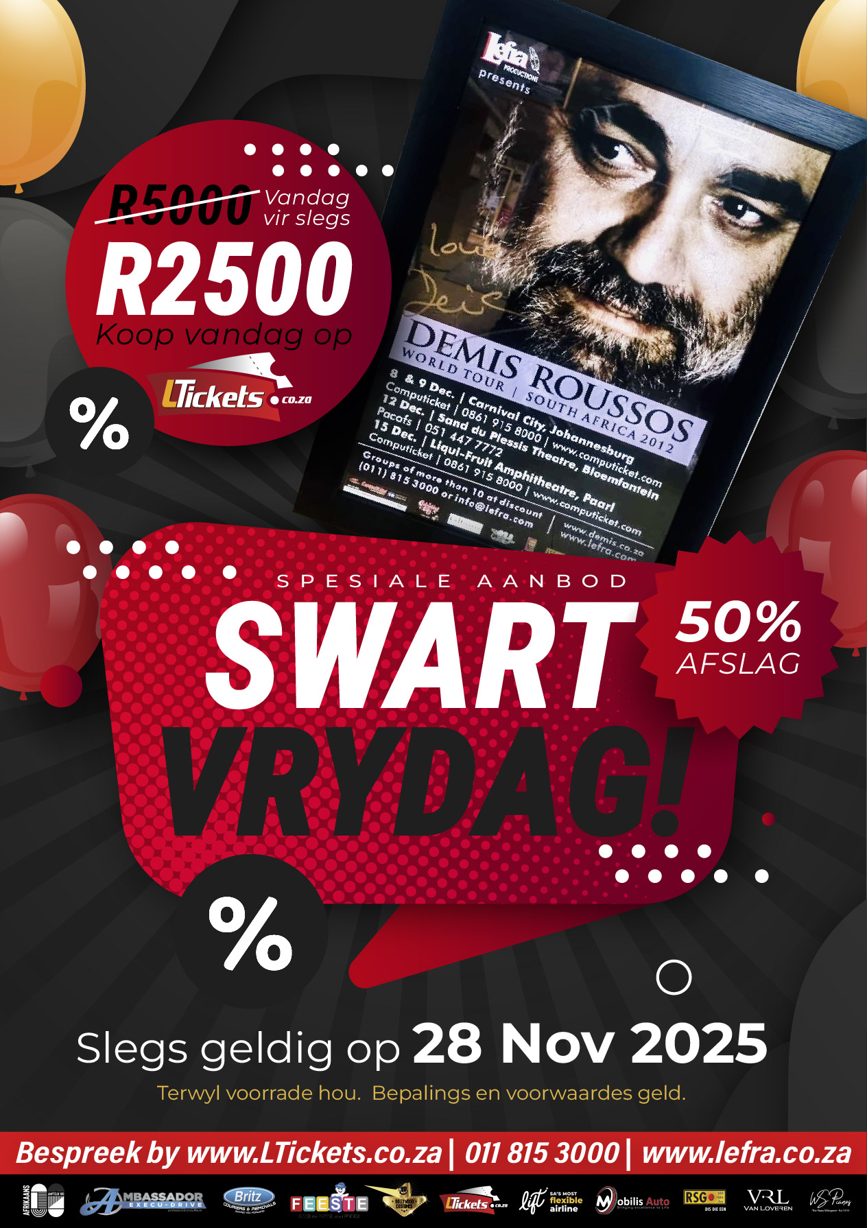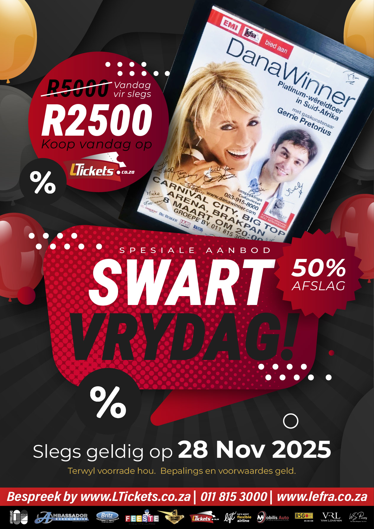 Kry jou kaartjies op Swart Vrydag (28 November 2025 tot 24:00) teen ongelooflike afslag op jou gunsteling “show”!