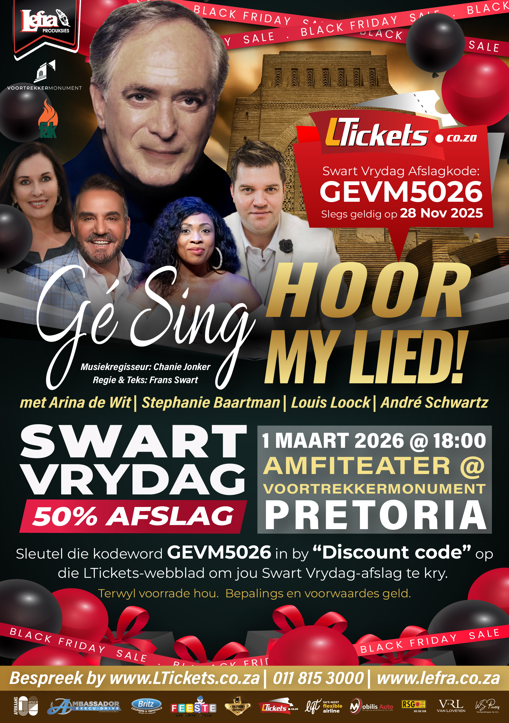 Meer as ’n dosyn Suid-Afrikaanse topkunstenaars, Chanie Jonker as musiekregisseur en Frans Swart as regisseur. Gebruik kode LEFRA5025 om jou Swart Vrydag-afslag te kry.