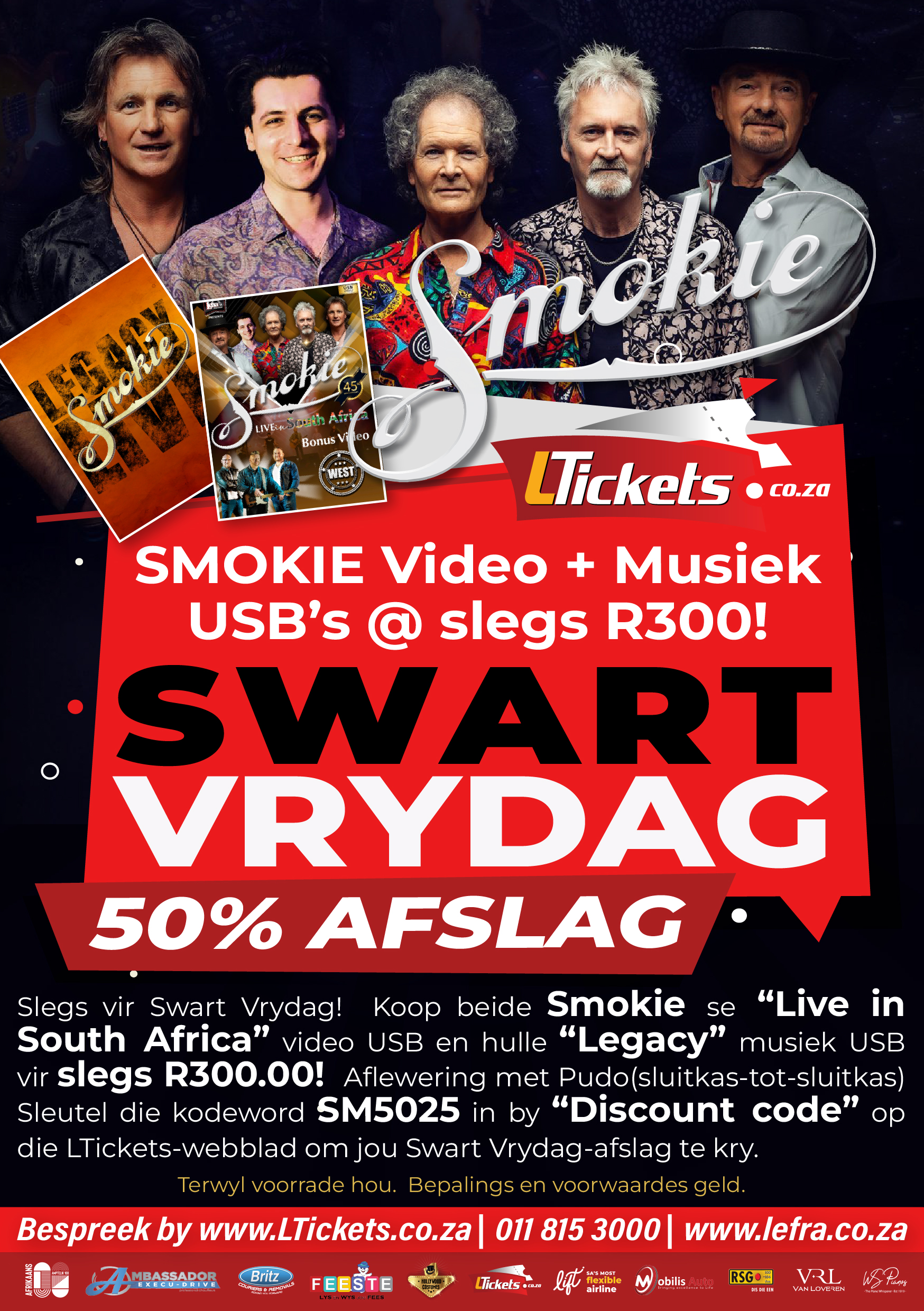 Kry beide Smokie se “Live in South Africa” video USB en “Legacy” musiek USB vir net R300. Aflewering via Pudo @ R67.50. Slegs vir Swart Vrydag!